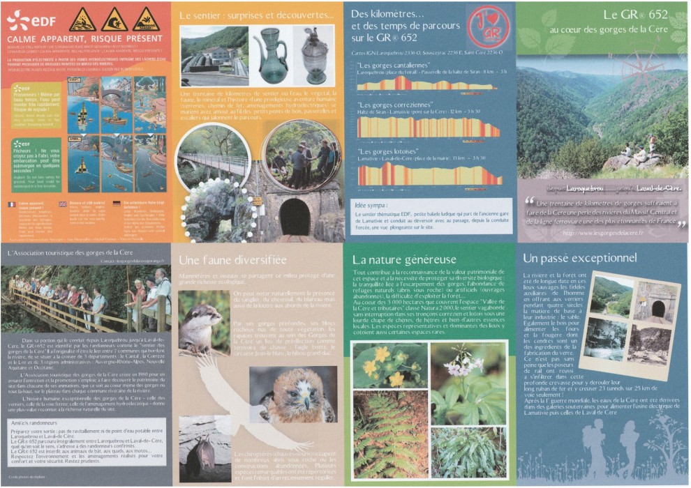 - Rénovation totale de la forme et du contenu de la plaquette touristique des Gorges de la Cère et du GR®652, accessible aux marcheurs dans les mairies et les offices de tourisme ;
